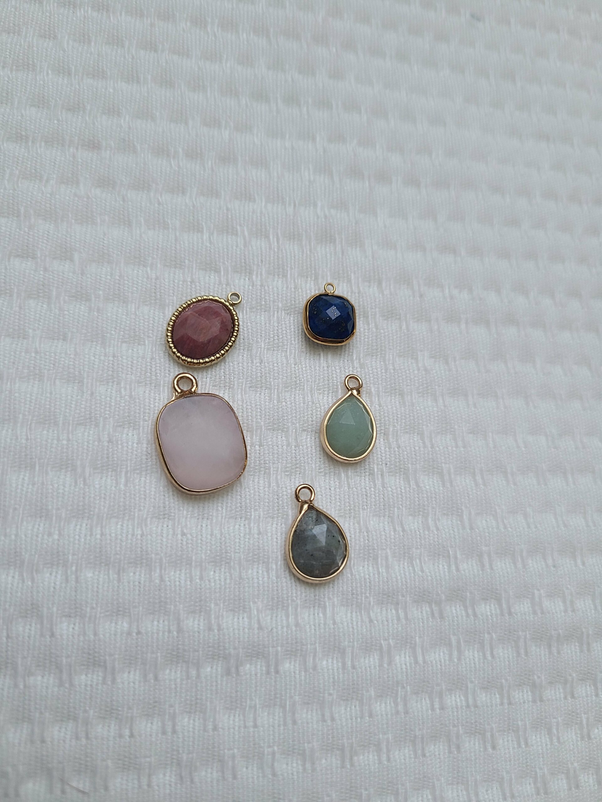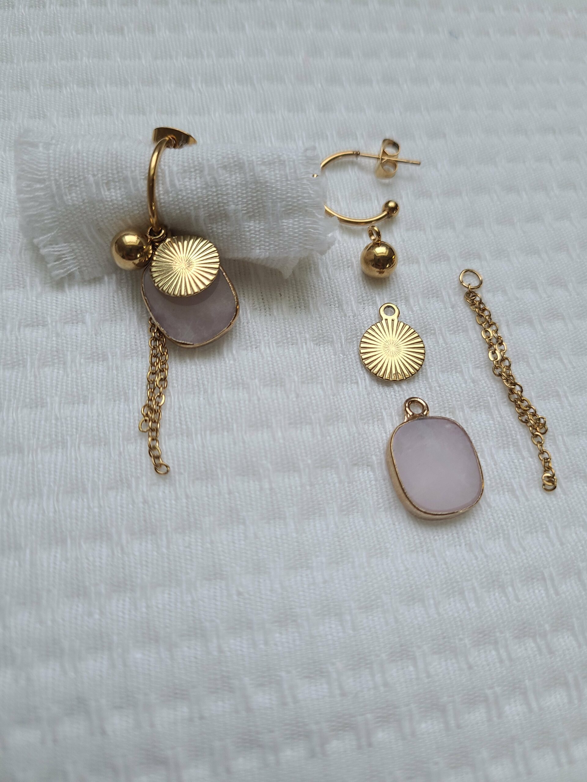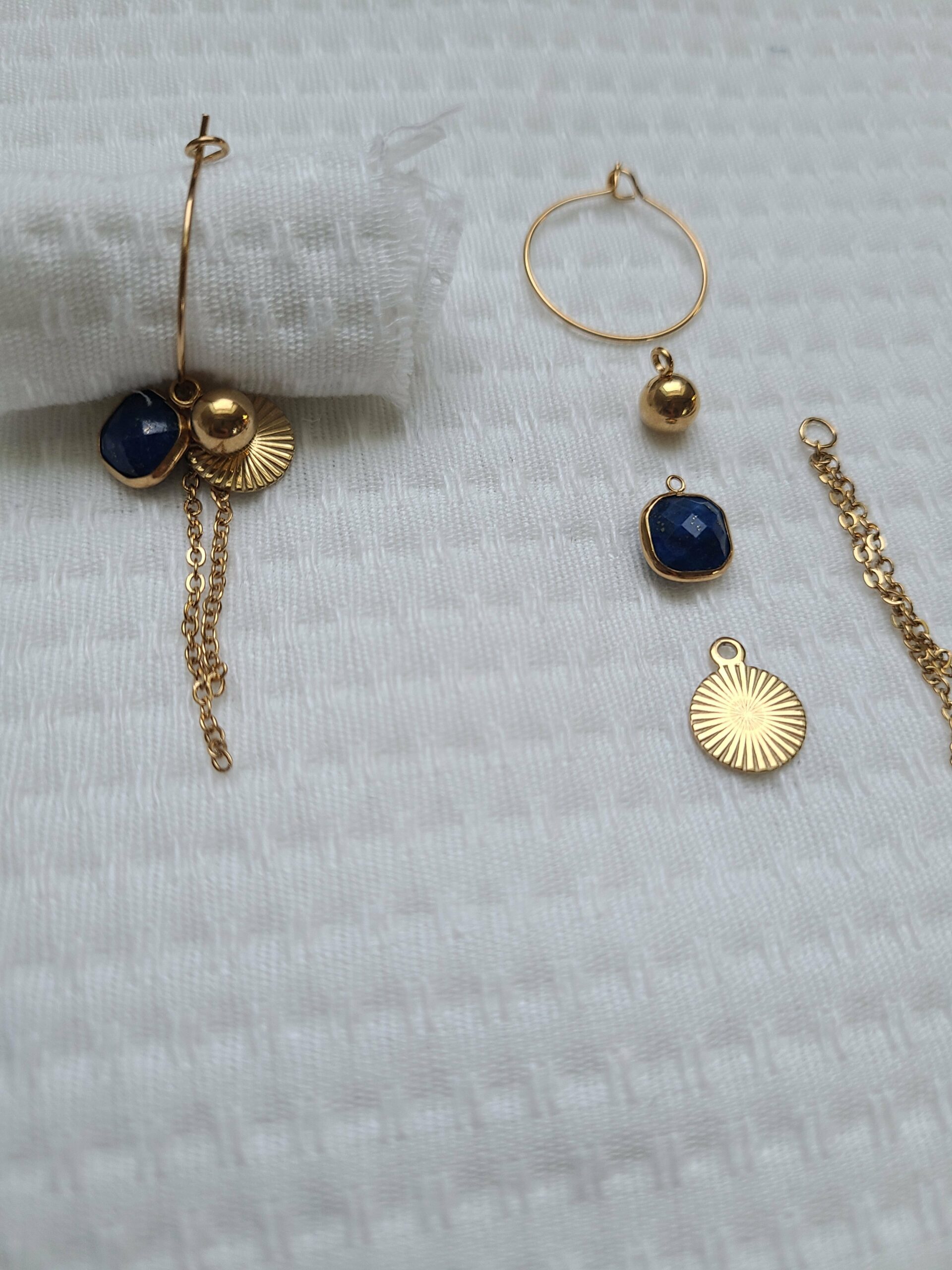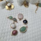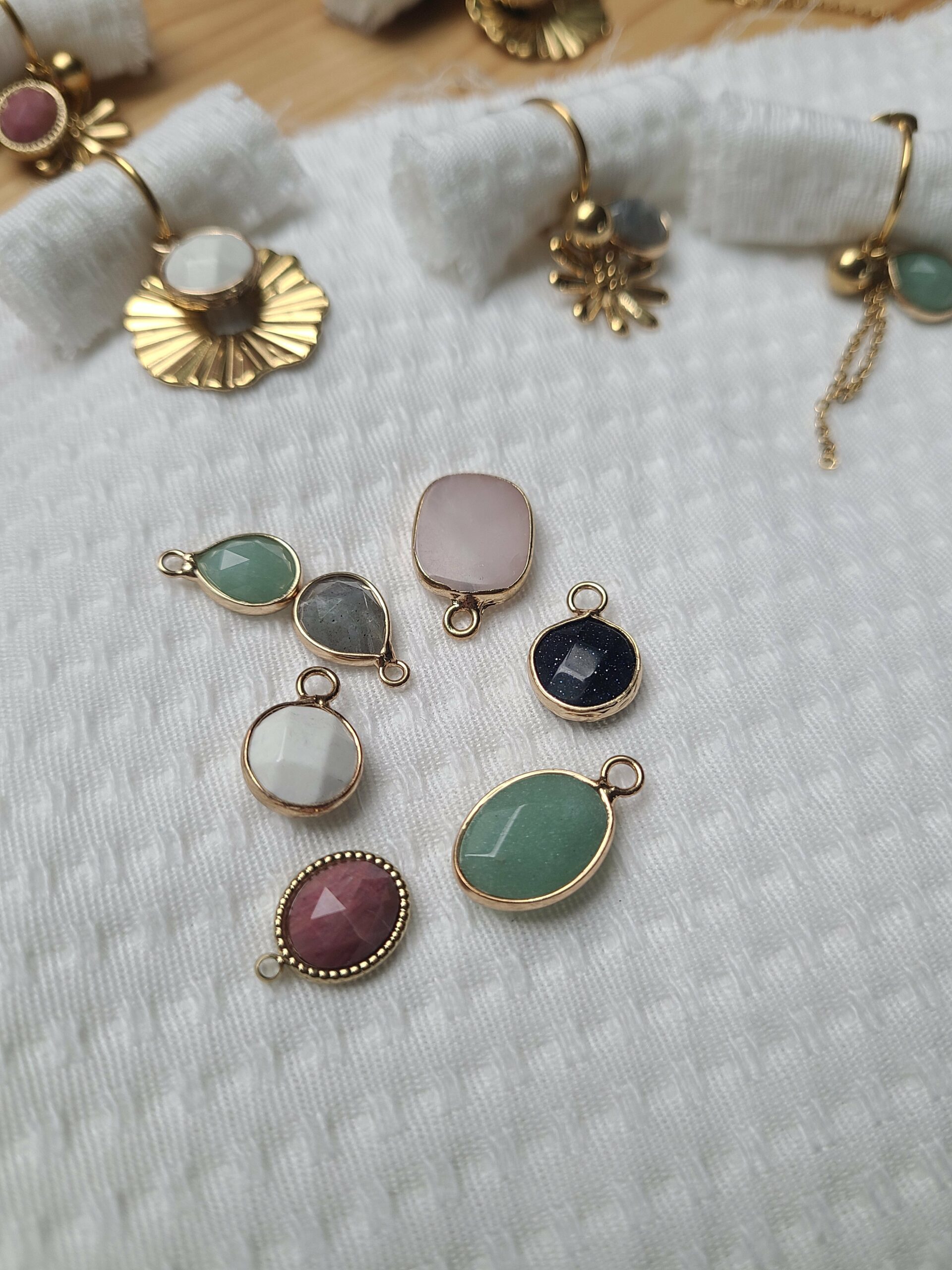 -Un pendentif en pierre : soit rectangle (en quartz) soit ovale (en rhodochrosite ) soit en goutte (en labradorite ou aventurine) soit carré (en lapis lazuli sur une créole fermée plus fine)