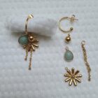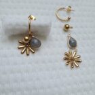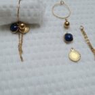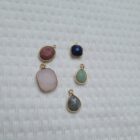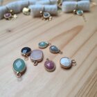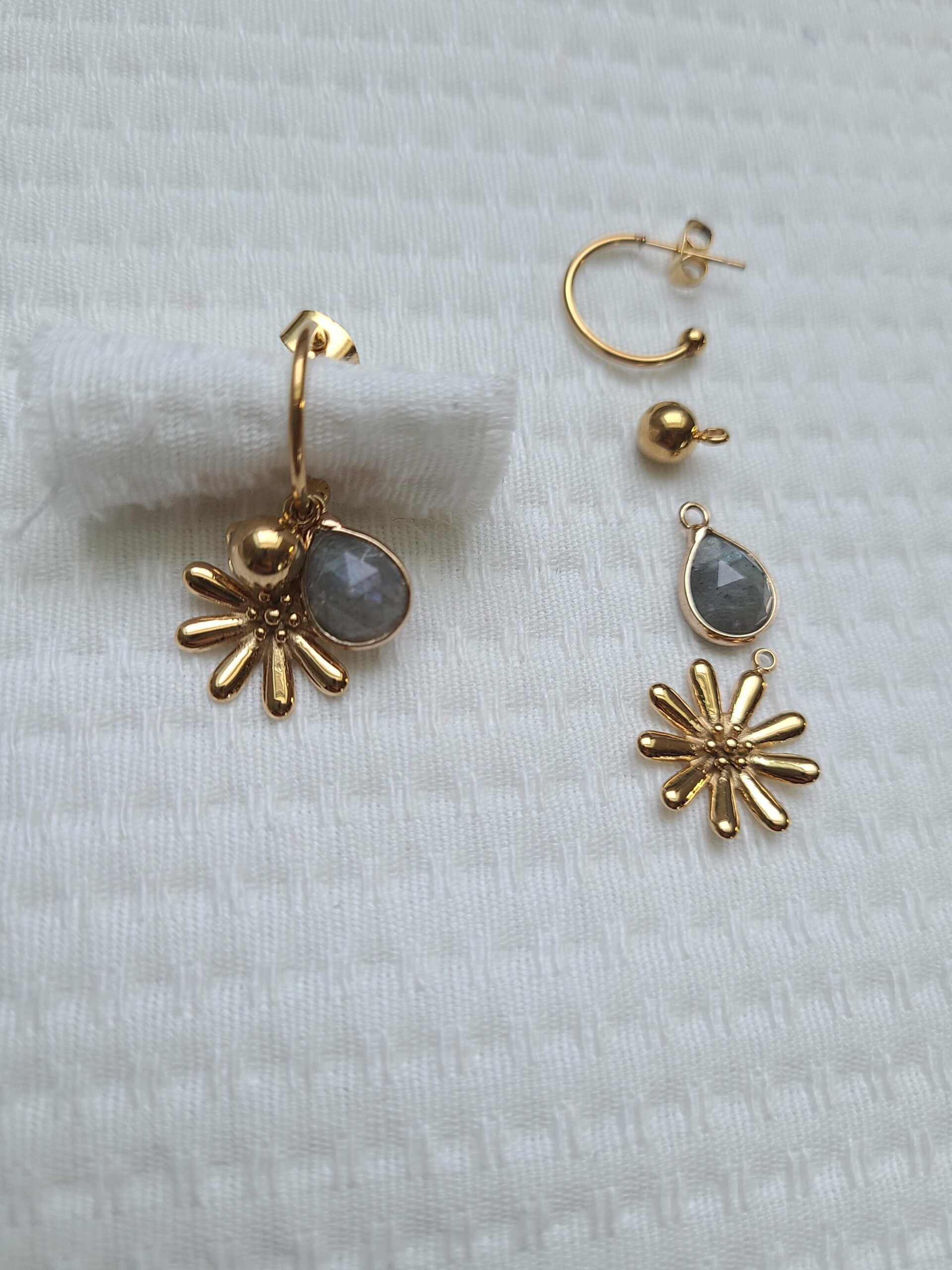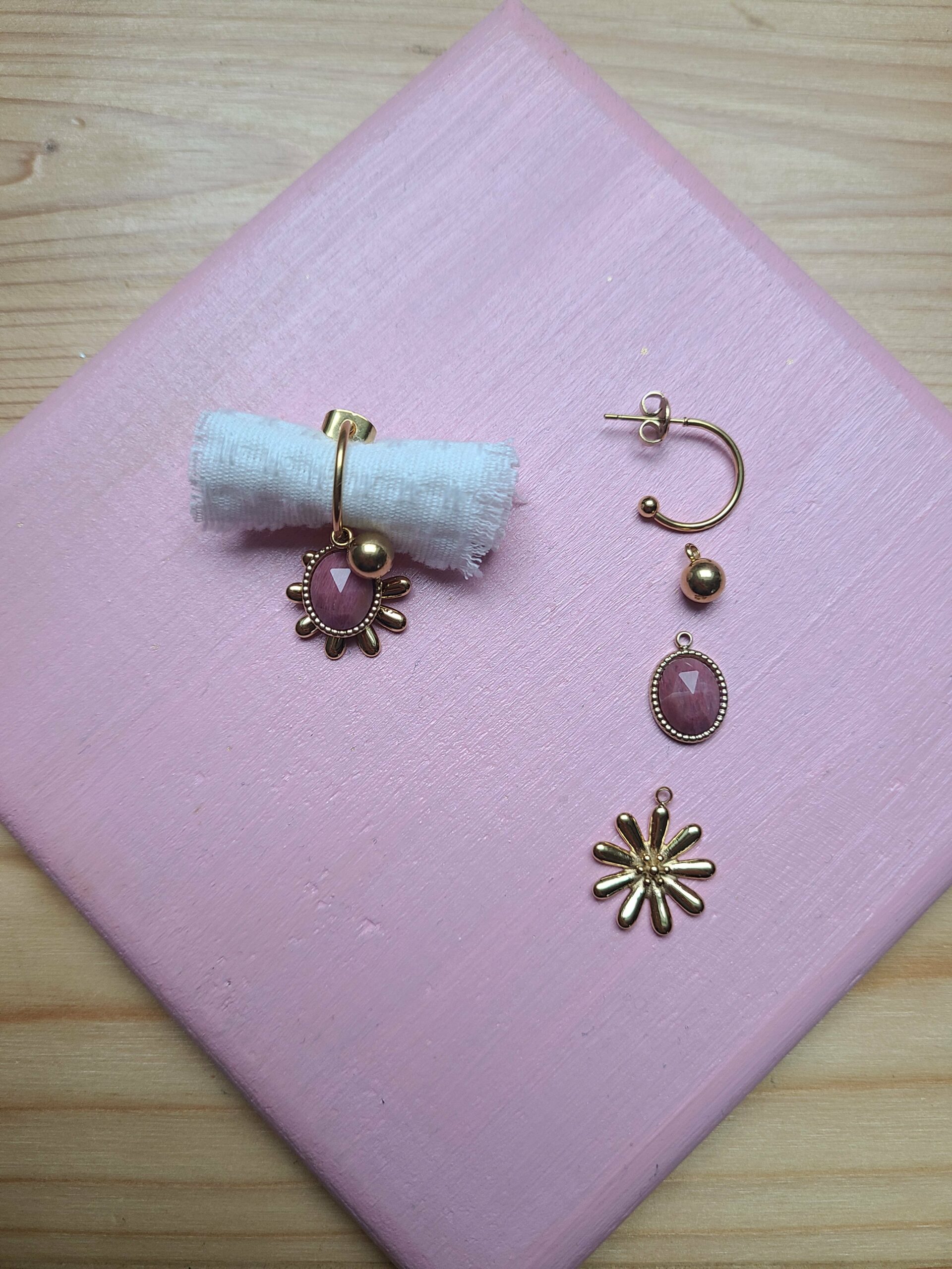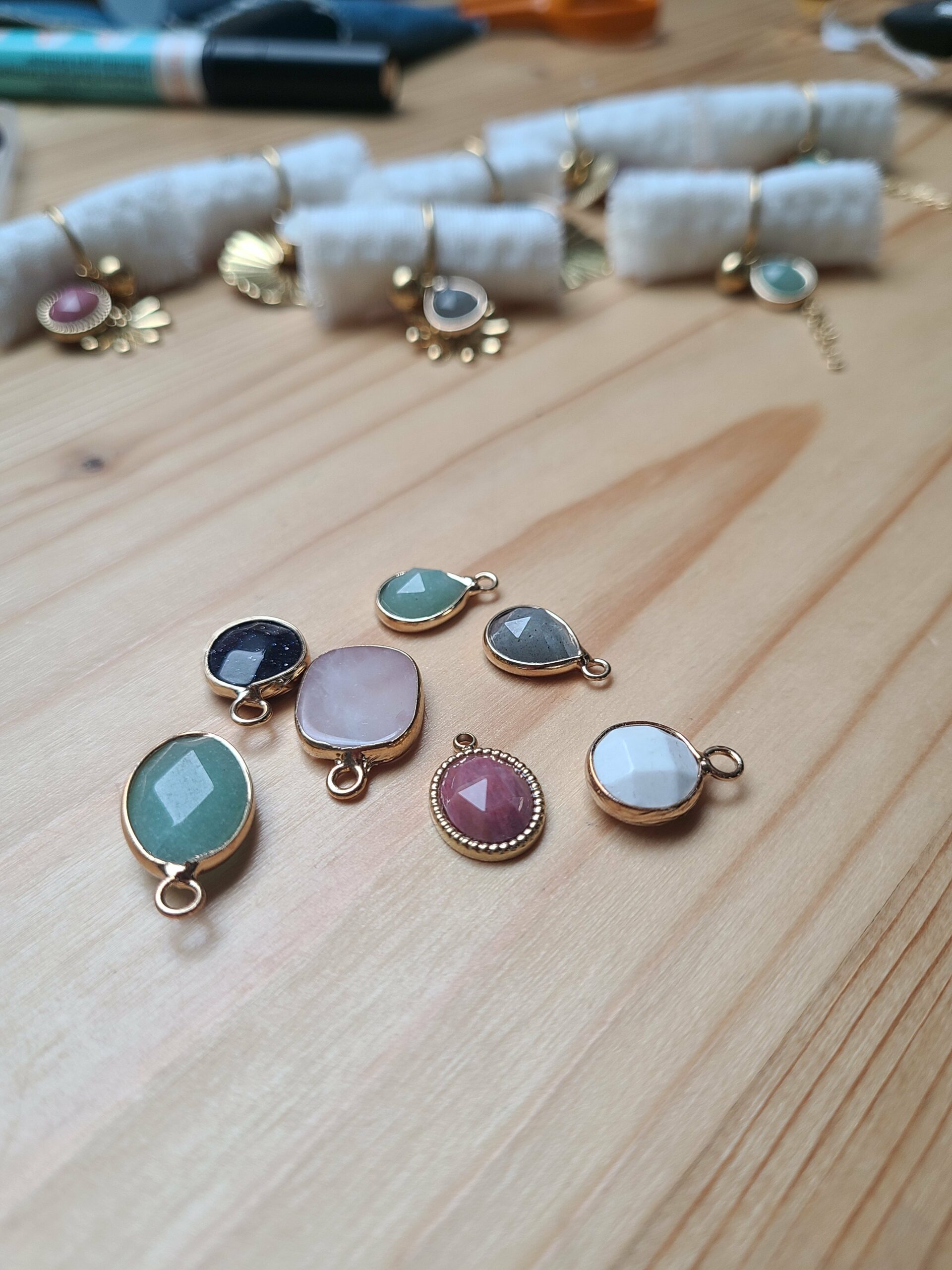 -Un pendentif en pierre : soit rectangle (en quartz) soit ovale (en rhodochrosite ) soit en goutte (en labradorite ou aventurine) soit carré (en lapis lazuli sur une créole fermée plus fine)