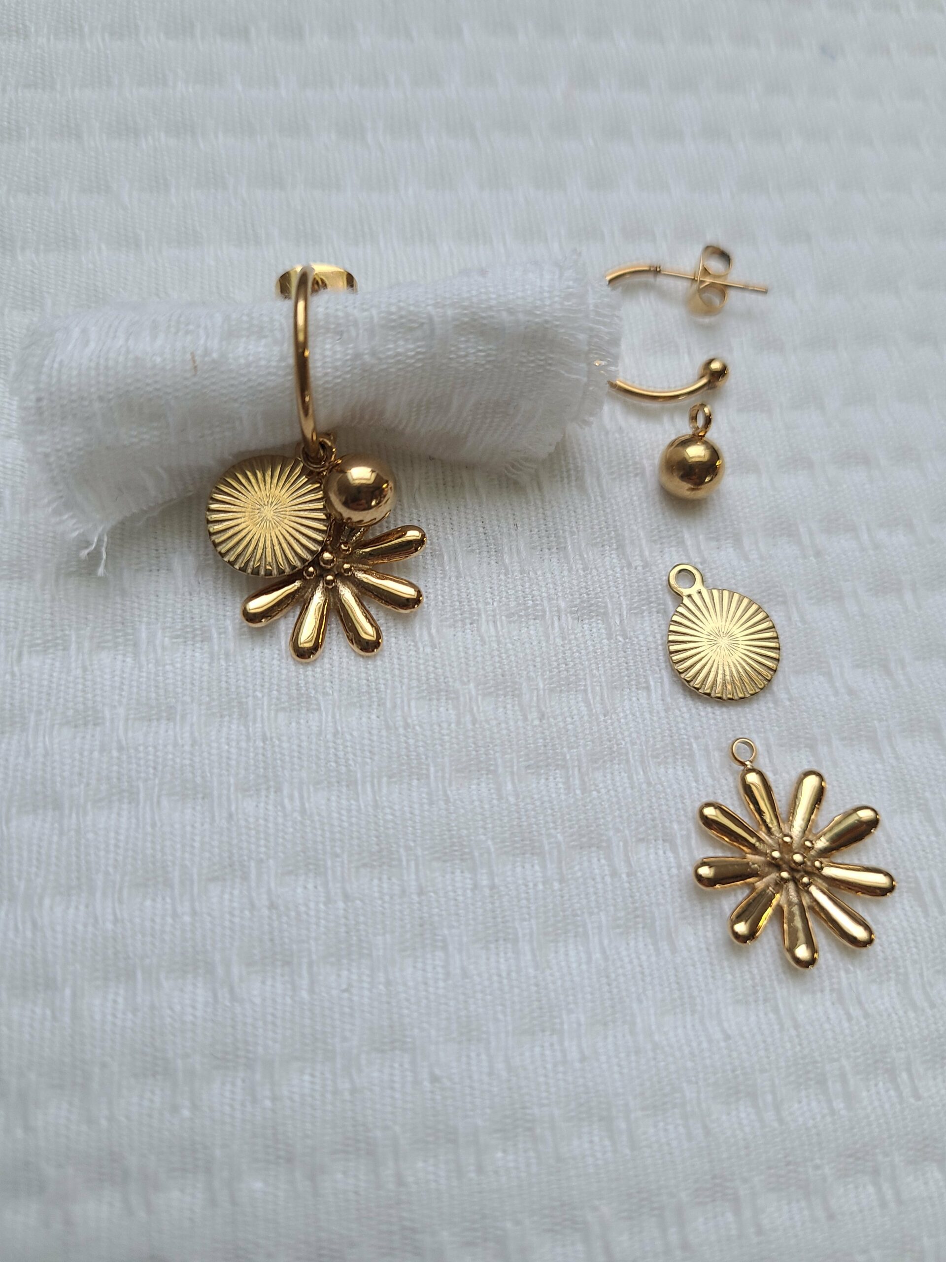 -Un pendentif en acier doré : soleil, fleur, sequin soleil, bille, chaine double