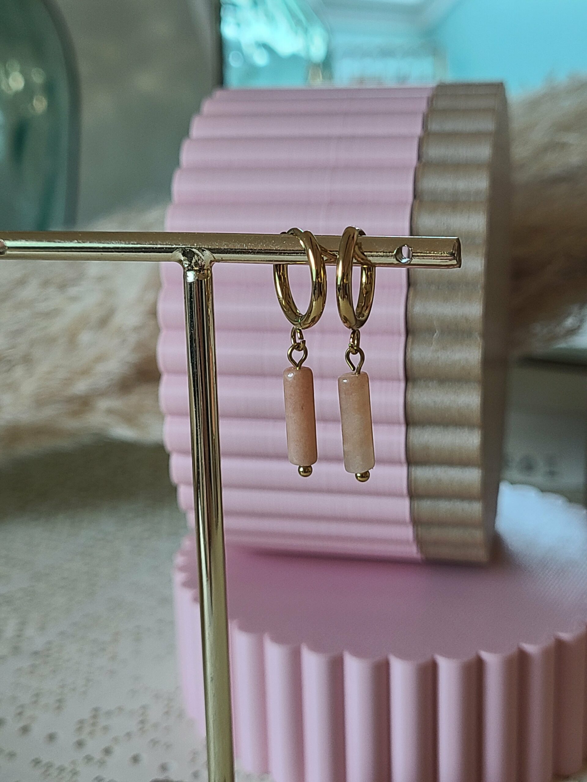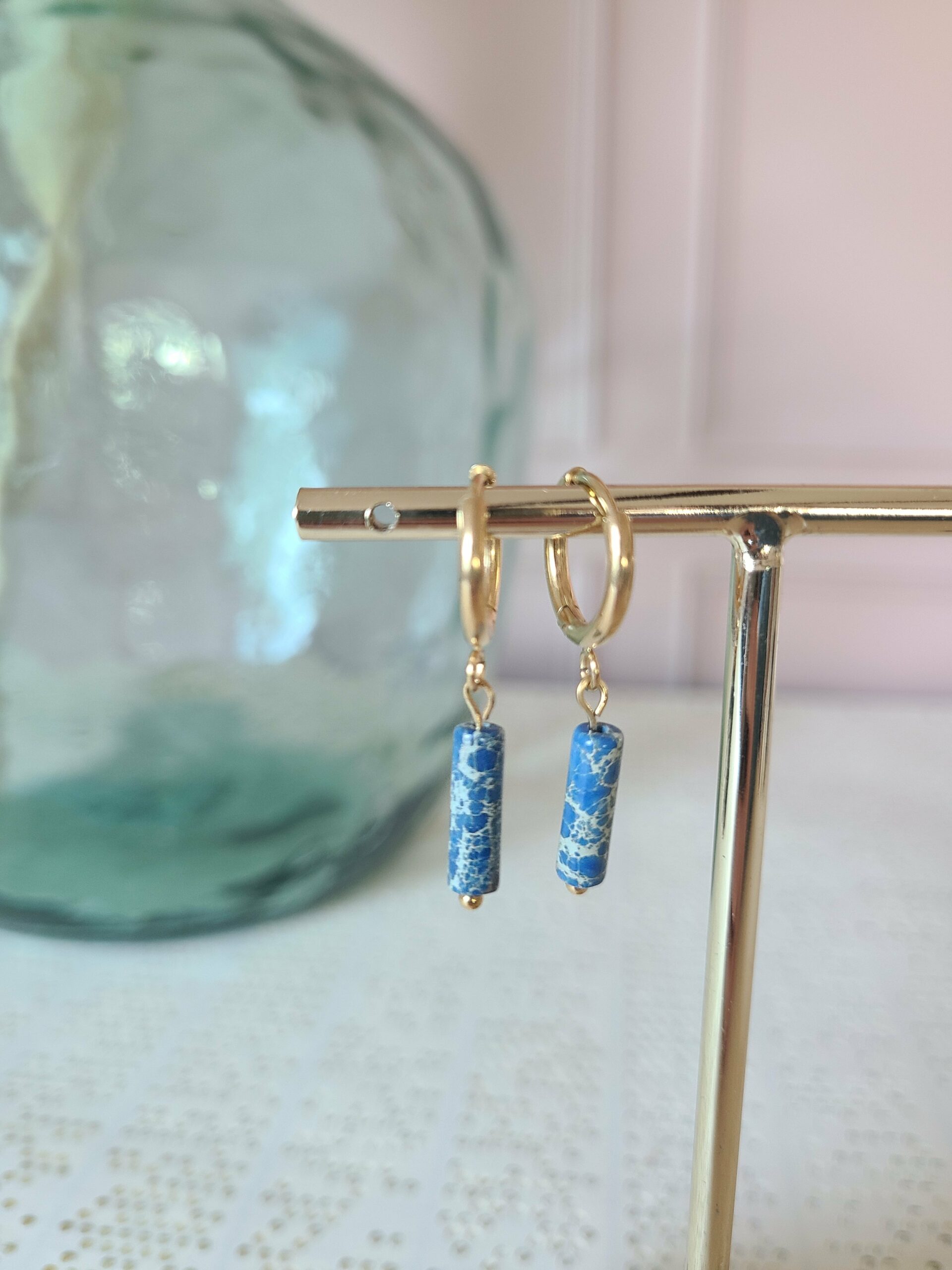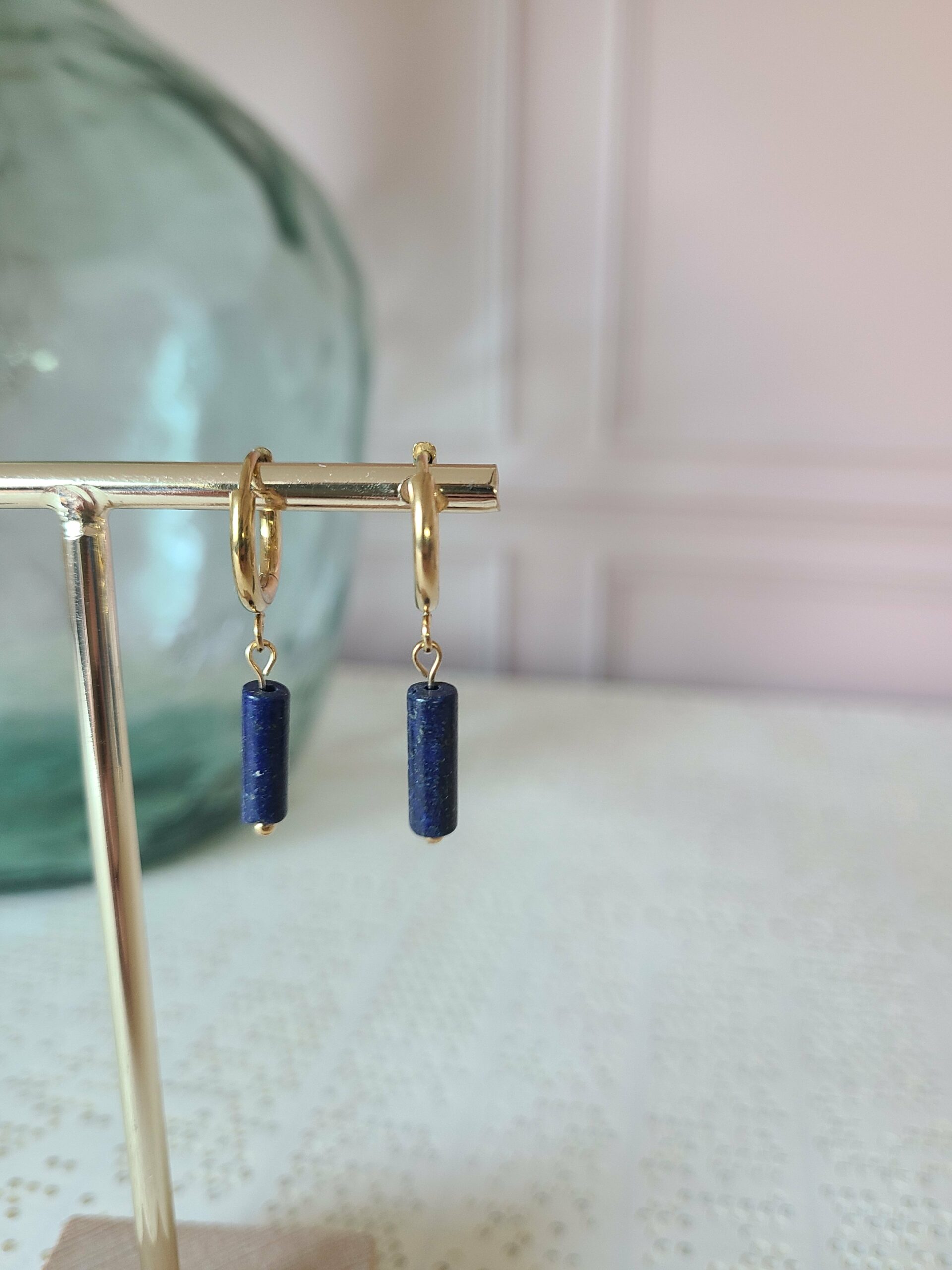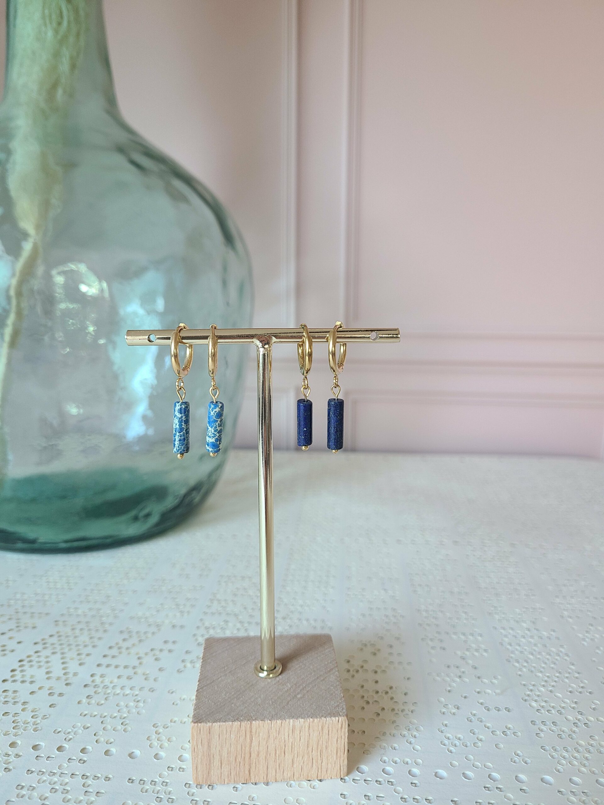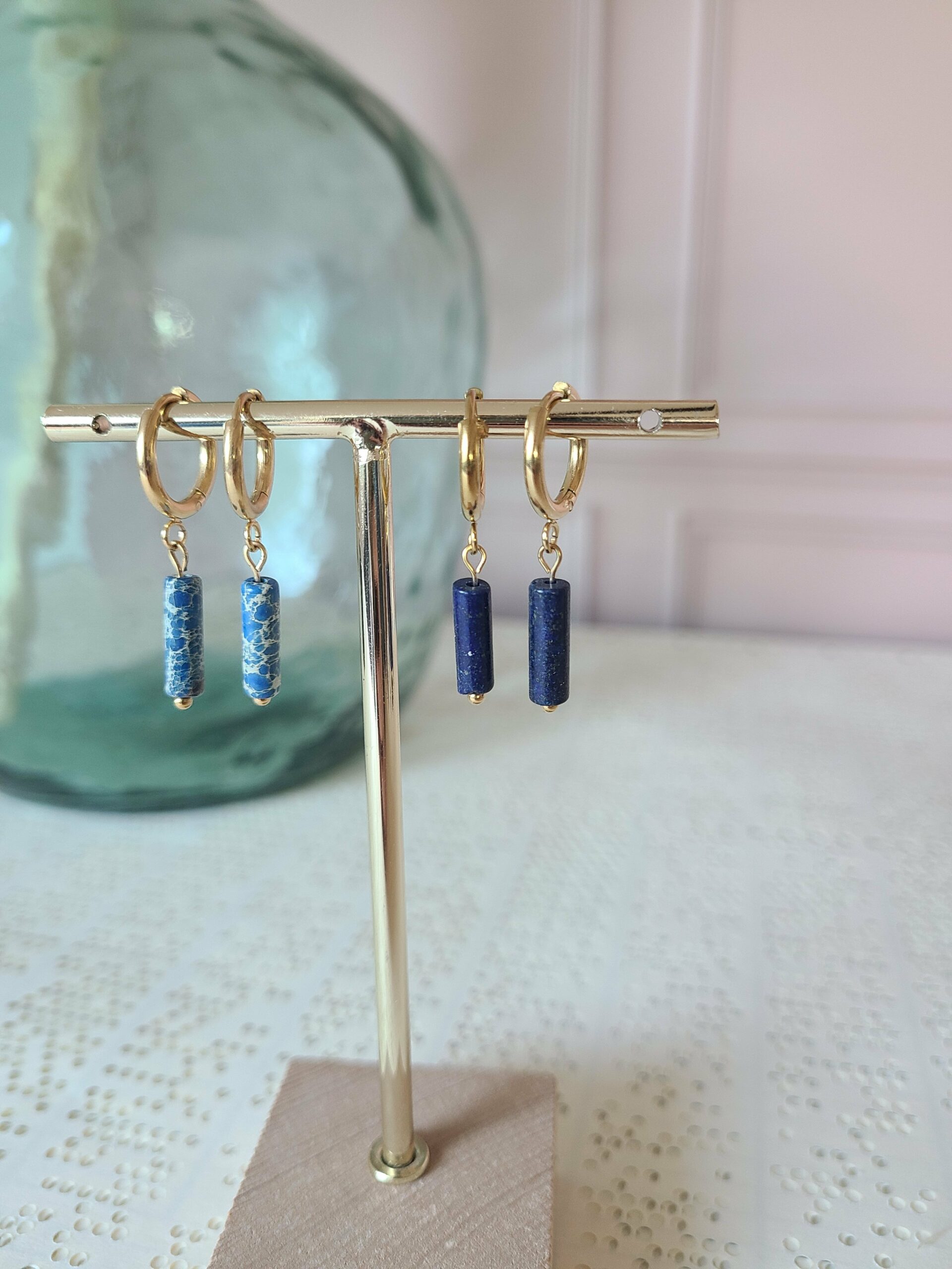 Voici les Axelle en quartz rose peche, en lapis lazuli marine et en bleu jean beige.