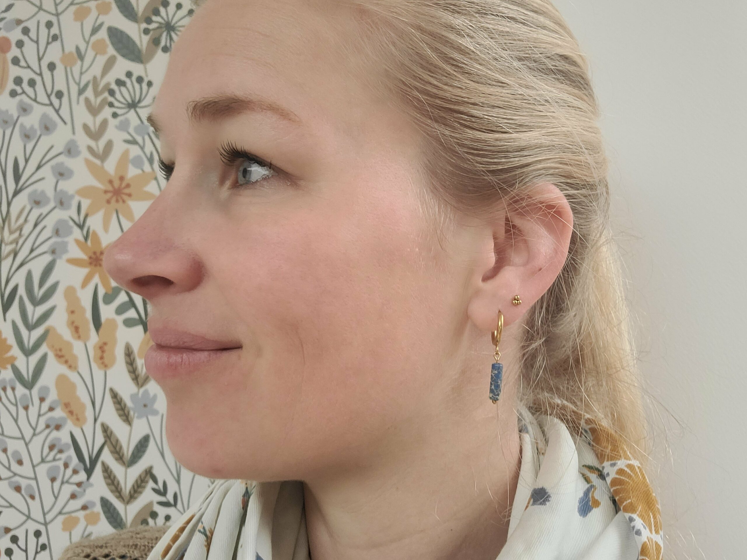 Cette paire de créole doré et cette perle tube en jaspe dalmatien, toute en simplicité, à porter seule ou en accumulation.