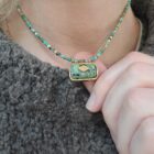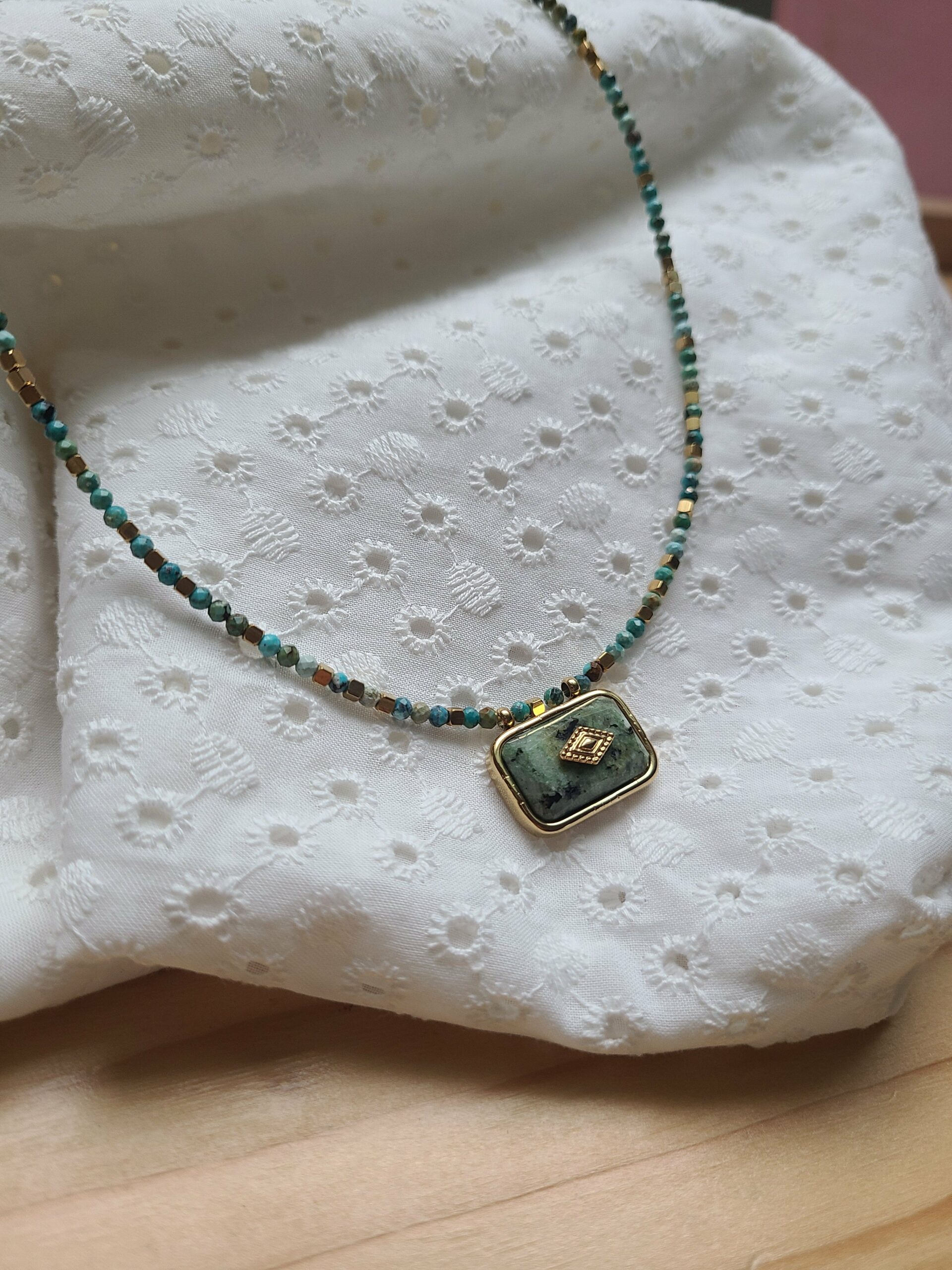 Les perles facettées s’accompagnent d’un pendentif rectangulaire en turquoise africaine également !
