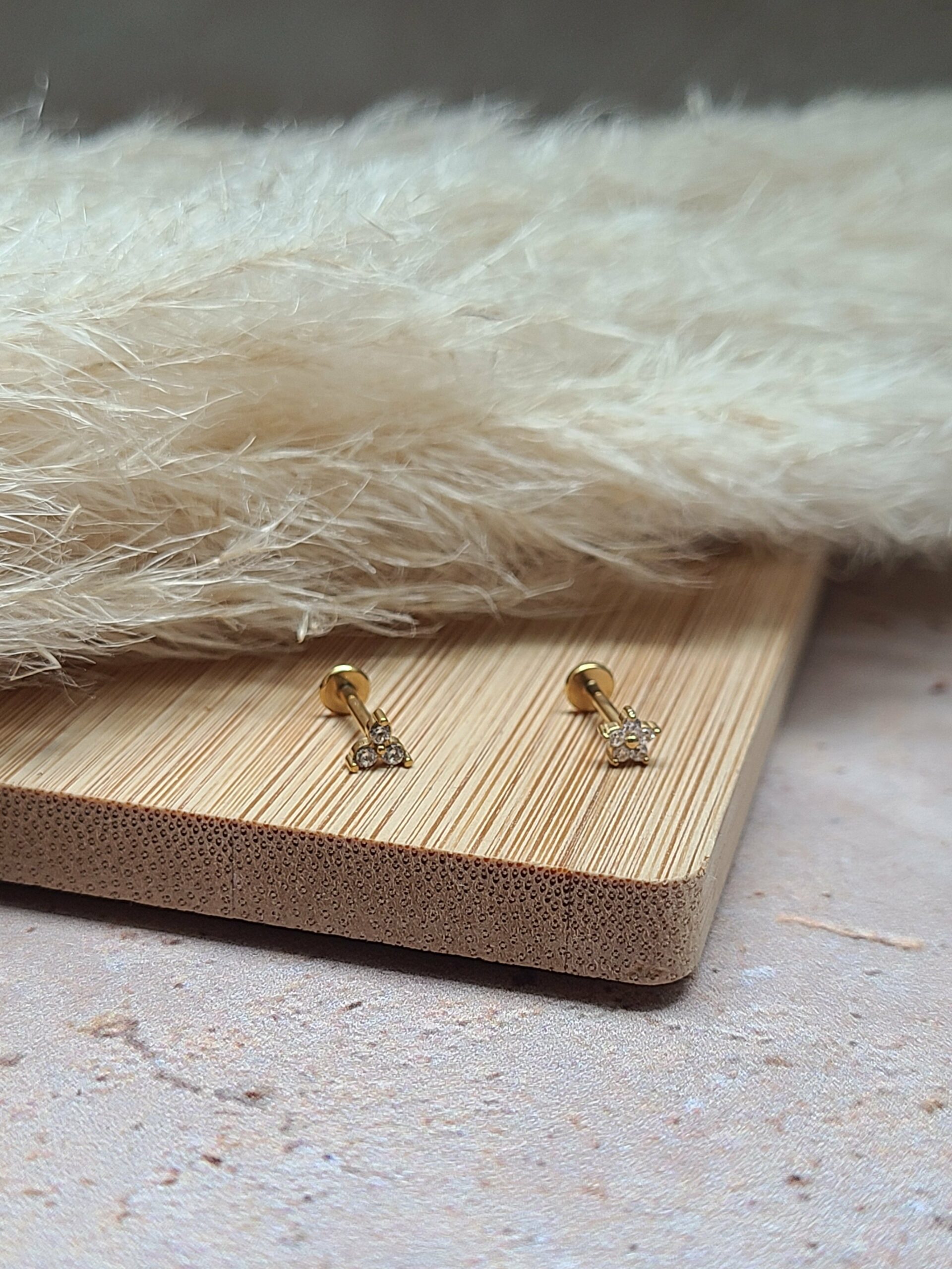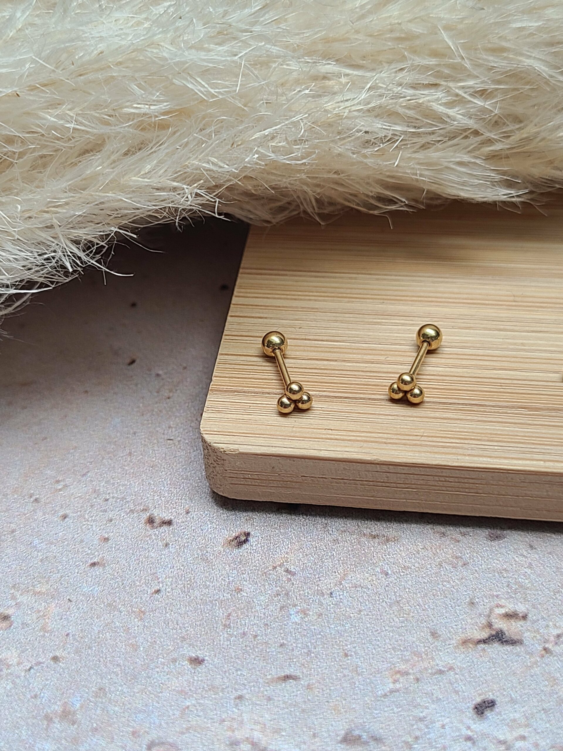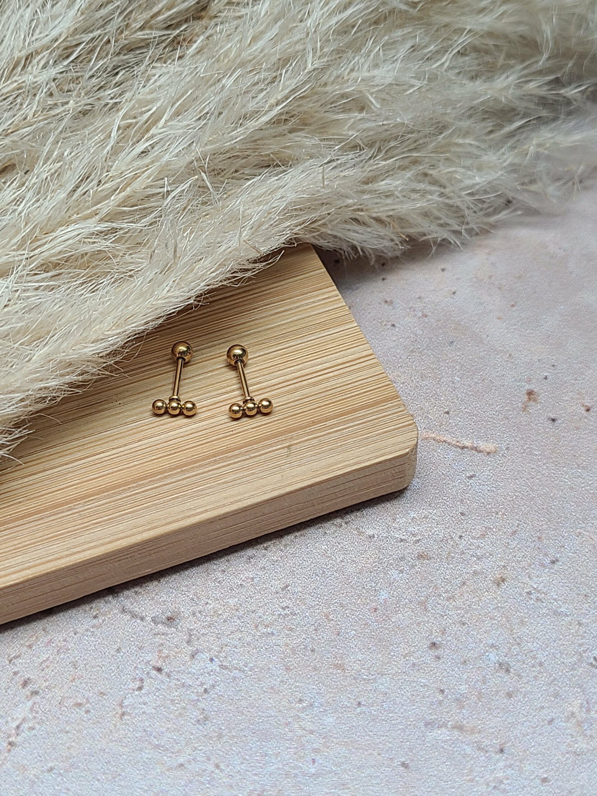 Ils sont différents des boucles classiques par leur fermoir. Celui ci se visse, soit derrière par une finition boule, soit devant, et sa finition est plate.